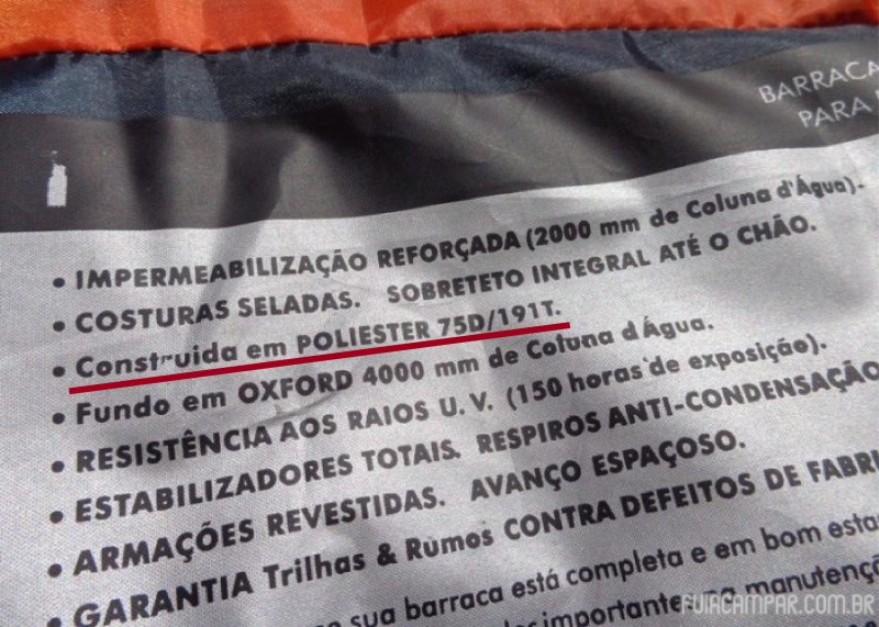 A maioria dos sobretetos das barracas é feito em Poliéster e normalmente vem com uma medida junto que é T (Tex) ou D (Denier). Veja o exemplo da imagem abaixo: o tecido do sobreteto é em Poliéster 75D/191T. Essas medidas identificam a densidade dos tecidos. Não vamos entrar nos detalhes do que significam estes números, pois entre as barracas vendidas no Brasil, esses valores praticamente não variam. Mas fica essa informação para os curiosos de plantão.